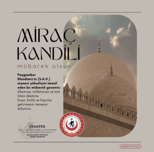 Miraç Kandili’miz Mübarek Olsun. Peygamber Efendimiz'in (S.A.V.) manevi yükselişini temsil eden bu mübarek gecenin; ülkemize, milletimize ve tüm İslam âlemine huzur, birlik ve hayırlar getirmesini temenni ediyoruz.